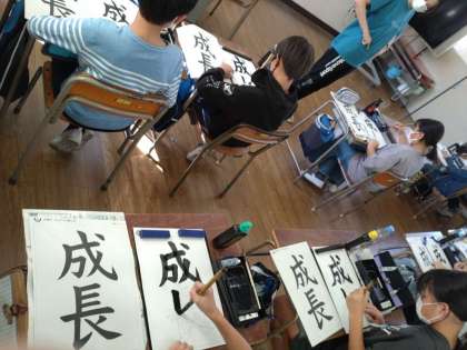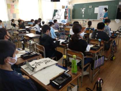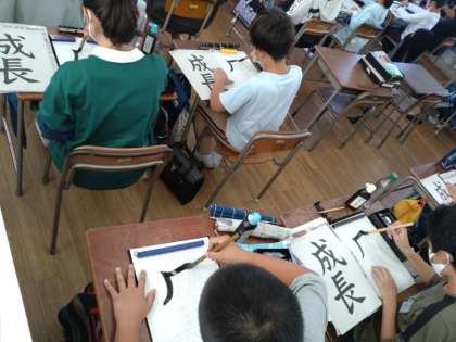 5年生は書写の時間に毛筆で「成長」を練習していました。テーマは「点画のつながりと接し方」です。「成」も「長」も1画目と2画目が接しますが、その接し方に特徴があるようです。手本をしっかりと確認して、シートに練習していきました。どちらの字も書き順も間違いやすいので、この機会に正確に覚えてほしいです。シートで文字をなぞりながらの練習が終わったら、いよいよ半紙に練習し、清書を仕上げます。