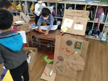 あそび大会の準備 公開日 2022/10/14 更新日 2022/10/14 お知らせ 2年生は生活科で「あそび方を くふうしよう」に取り組んでいます。1組では、遊び大会の準備が着々と進んでいるようです。的当てやくじ引きなど、わくわくするような手作りの遊び場ができあがっていました。 「遊び大会」というだけあって、司会や初めのあいさつ、終わりのあいさつもあるようです。原稿を作って練習していました。 いいね(0)