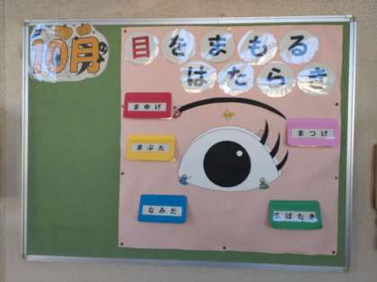 目をまもるはたらき 公開日 2022/10/14 更新日 2022/10/14 お知らせ 保健室の横の掲示板に「目をまもるはたらき」について掲示されていました。「まゆげ」「まつげ」まぶた」「なみだ」「まばたき」、これら、目の一部や動作が目にとって大切な働きがあります。それぞれの文字をめくると、その働きが書かれています。たとえば、「まばたき」については「ほこりやゴミ、なみだがかわくのをふせぐ。」と、「まぶた」については「けがやかんそうからまもる。」と書かれています。 いいね(0)
