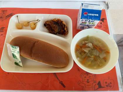 10月18日(火)の給食は、コッペパン・ソフトマーガリン・牛乳・ナスのミートグラタン・鶏肉と野菜のスープ・さくらんぼ(缶)です。サクランボの主な産地は山形県で、日本のサクランボの半分以上を作っています。給食では、着色料(食品に色をつけるもの)を使っていない、山形県産のサクランボの缶詰が登場します。自然なクリーム色をした甘いサクランボで、とても美味しかったです。