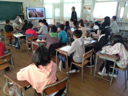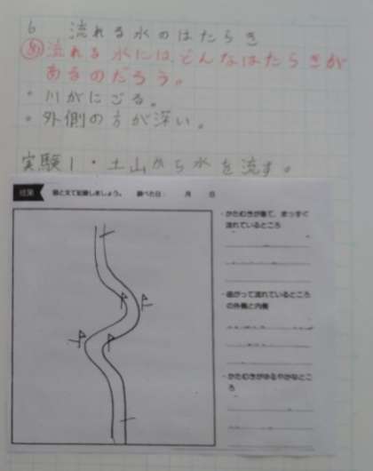 流れる水のはたらき 公開日 2022/10/19 更新日 2022/10/19 お知らせ 5年生は理科で「流れる水のはたらき」を学習しています。前時に運動場の土屋までS字に曲がる川を作って、そこに水を流す実験をしました。本時はその実験の様子を撮影した映像を観ながら、わかったことをまとめていきました。S字に曲がる内側と外側では流れる水のはたらきが大きく違うようです。たかが水ですが、そこには地形を変えるような大きな力が秘められているようです。 いいね(0)