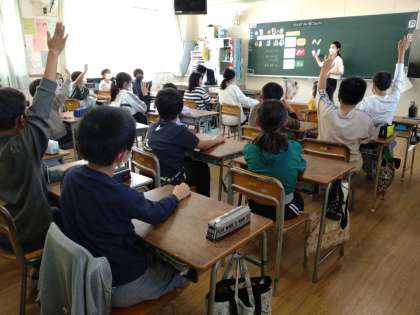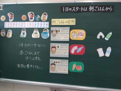5年2組では、食育の授業で「1日のスタートは朝ごはんから」について学習していました。児童は、朝ごはんの役割について、以前保健の授業で学んだことや、給食室横に掲示されていたことをよく覚えていました。授業のはじめにもう一度思い出した後、栄養素のバランスが取れた朝食について考えていました。また、朝ごはんを美味しく食べるにはどんなことを工夫したらいいのかについても学びました。