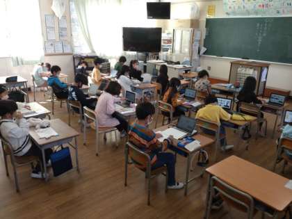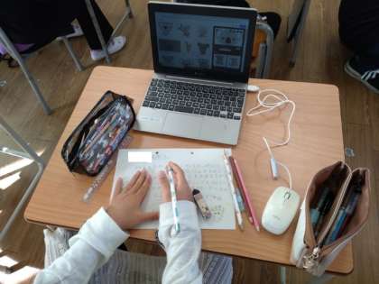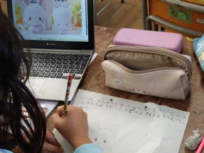 2年1組では学級活動の時間に、これまでお世話になったことに対して感謝のお手紙を書いていました。相手にお礼の気持ちが伝わるように心を込めて書いているのがわかります。挿絵もタブレットで調べてきれいに描いています。