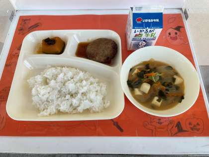 10月26日(水)の給食は、ごはん・牛乳・和風ハンバーグ・みそ汁・かぼちゃのいとこ煮です。本日の給食では、かぼちゃのいとこ煮に小豆が使われています。小豆はマメ科の植物で、日本では古くから食べられてきました。骨や歯を丈夫にするカルシウム、血をつくるもとになる鉄、お腹の調子を整える食物繊維などが多く含まれています。小豆とかぼちゃの愛称はぴったりで、とても美味しかったです。