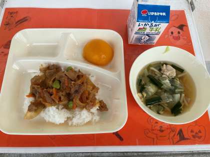 10月27日(木)の給食は、ピリ辛丼・牛乳・中華スープ・黄桃(缶)です。