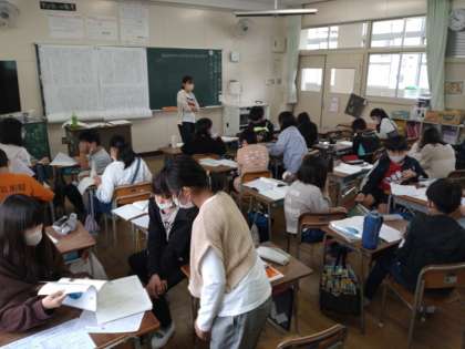 6年生は国語科で「町の未来をえがこう」を学習しています。最終的に「町の未来を描く」をテーマにしたプレゼンを作ります。その準備として「町の幸福論」を読み取ります。本時では、説明文の構成について近くのお友だちと話し合っていました、「では」「まず」「1つ目の例は」「2つ目の例は」などのつなぐ言葉や、「〜になってくるのだろうか。」のような問いかけに着目していました。以前学習した「イースター島にはなぜ森林がないのか」を思い出し「序論」「本論」「結論」「問題定義」「主張」などの言葉が、話し合いの中で飛び交っていました。
