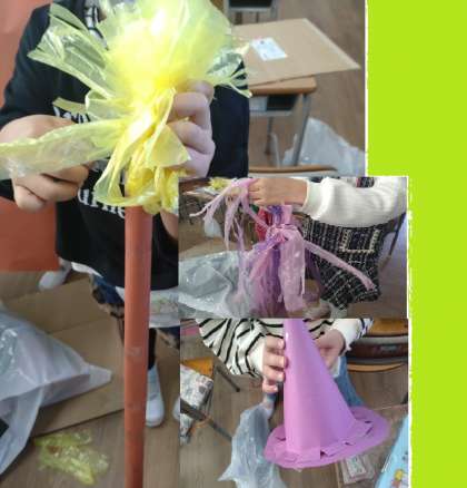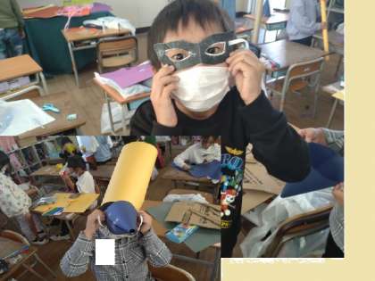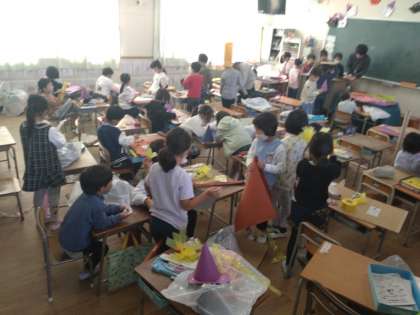 ハロウィーンパーティー 公開日 2022/10/28 更新日 2022/10/28 お知らせ 1年生は図画工作科の時間に「ハロウィーンパーティー」の準備をしています。前時には、かぼちゃやお化けを作りました。出入口の戸や教室の壁面に飾られています。本時では、仮装するための帽子や杖(ほうき?)、スカート、メガネなどを色画用紙やスズランテープで作っていました。楽しいパーティーにしてほしいです。 いいね(0)