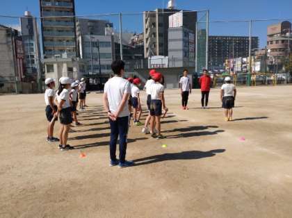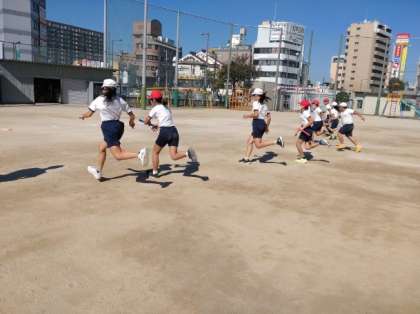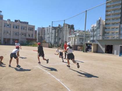 3時限目は、全員でリレーをします。最初にバトンパスやリードの仕方についてご指導していただきました。リードについては、バトンを受け取る側がいかにしてスピードを落とさずにもらえるのか、練習を通じてわかりやすく説明していただきました、その後、紅白に分かれて、実際にリレーをしました。途中差がつきましたが、最後は接戦になりました。最後まであきらめないという気持ちが表れていました。