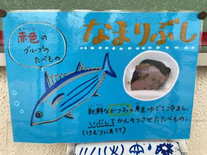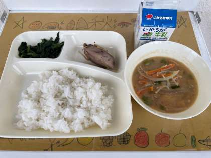11月1日(火)の給食は、ごはん・牛乳・なまり節の生姜煮・固形チーズです。なまり節は、新鮮なカツオを原料にして作られます。カツオの身をゆでて冷まし、骨や皮を取り除いた後、いぶして(煙にあてて)乾燥させたものです。カツオは、赤のグループの食べ物で、主に体をつくるもとになる働きがあります。しょうがと醤油の味を吸った身をほぐして、ごはんと一緒に食べると最高の味です。