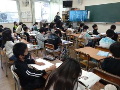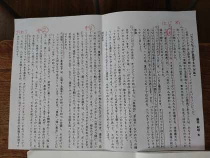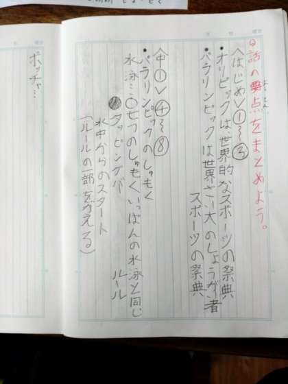 3年生は国語科で「パラリンピックが目指すもの」を学習しています。すでに、全文をB41枚にまとめた用紙に、「はじめ・中・おわり」のように文章の構成を書き込んでいて、「はじめ」「中(1)4〜8段落」の部分の要点をノートにまとめていました。本時では、「中(1)9段落」の部分から要点をまとめていきます。ここではボッチャについて書かれているようです。果たしてどんな競技なのか、大事な言葉を基に読み取っていきました。