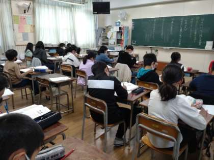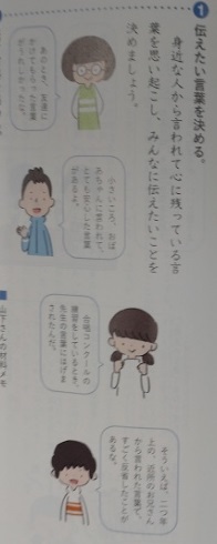 5年生は国語科で「伝えたい心に残り言葉」について学習しています。2組では、「(1)伝えたい言葉(心に乗っている言葉)・(2)誰から言われたのか(3)どんなときに言われたのか。(4)どんな気持ちになったか」について材料メモに集めていきます。メモには、家族や習い事の先生から、あきらめたら終わりであることや、できたことをほめられた言葉などを書き留めてられていました。自分が変わるきっかけになった素敵な言葉を友だちに伝えてほしいと思います。