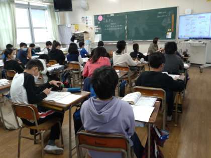 5年生は算数科で「単位量あたりの大きさ」を学習してきました。1組では「たしかめポイント」の問題を解いて、本単元の復習をしていました。時速を求め、その時速を分速や秒速になおしていきます。さらに、道のりや時間を求めていきます。公式を覚えていなくても、単位量あたりの大きさを正しく理解していたらこの問題は解くことができます。