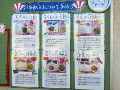 行事献立について知ろう 公開日 2022/11/02 更新日 2022/11/02 お知らせ 給食室の横の掲示板に「行事献立について知ろう」が掲示されています。「4月は入学祝い献立、5月は……。」というように、大きな行事があるときに献立が工夫されています。楽しみにしてほしいと思います。 いいね(0)