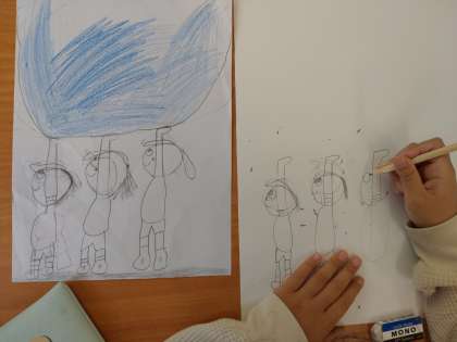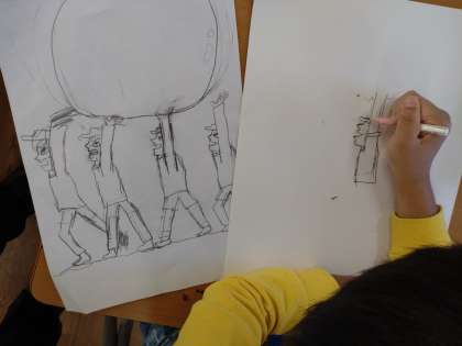 大玉送りの絵 公開日 2022/11/04 更新日 2022/11/04 お知らせ 2年生は図画工作科で「大玉送りの絵」を描きます。1組では前時までに下描きを描き終え、本時で画用紙に本格的に描き始めます。先生から「手(腕)・体・顔・足・大玉」の順に描くように指導がありました。描き始める手を大きく描くと、その後に続いて描く体や顔も自然と大きくなるからです。 下描き以上にダイナミックな大玉送りの絵になってほしいと思います。 いいね(0)