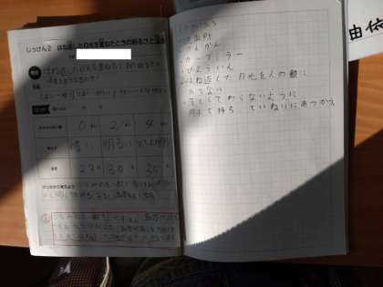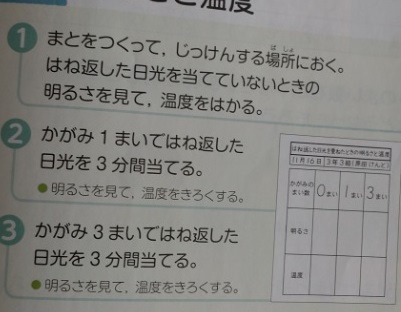 鏡 公開日 2022/11/09 更新日 2022/11/09 お知らせ 3年生は理科で「光のせいしつ」を学習しています。本時では、鏡で跳ね返した日光を重ねると温度がどのように変化するか調べた実験のまとめをしていました。鏡1枚より、日光を鏡3枚で集めた方が気温は上がるようです。 その後、鏡はどんなところで使われるか考えていました。「道路のミラー」「洗面所」、そして、「散髪屋」などが出されました。鏡を扱う注意点についても話し合い、「人に向けない」「割れないように大切に扱う」などが出されました。 いいね(0)