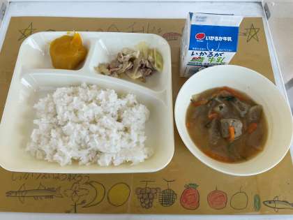 11月10日(木)の給食は、ごはん・牛乳・鶏肉と野菜の炒めもの・いわしのつみれ汁・かぼちゃういろうです。ういろうは、米粉・砂糖などを混ぜて蒸して作ります。上に小豆をのせた「水無月」や生地に抹茶を混ぜたものもあります。今日の給食には、かぼちゃペーストを混ぜた「かぼちゃういろう」が出ます。適度な甘さで、もちもちした食感がとても美味しかったです。