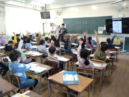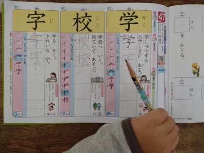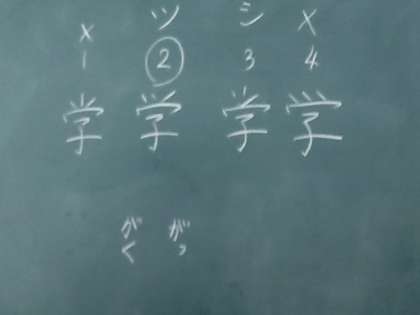 1年生は国語科で新出漢字「学」「校」を学んでいます。「学」の上の部分について、先生から4つのパターンが示されました。「どれが正しいでしょう。」2と3に多くの手が挙がりました。「3はカタカナの『シ』に似ている。」児童は間違いに気づいたようです。