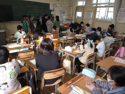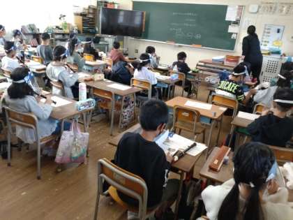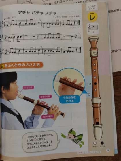 3年生は音楽科の時間に「アチャ パチャ ノチャ」のリコーダー演奏に取り組んでいました。1オクターブ高い「ド」や「レ」をきれいな音で出せるように息の流れに気をつけます。また、左手の指だけで穴を抑えるので、リコーダーをうまく支えなければいけません。がんばって練習していました。