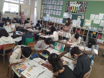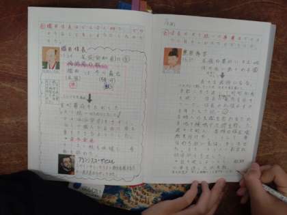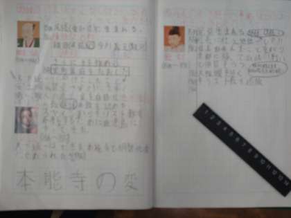6年生は社会科で「戦国の世の統一」について学習しています。前時では、織田信長が天下統一するに向けて行ったことをまとめていました。ノートには「本能寺の変」で終わっているようです。本時では、織田信長が天下統一を目指してきた事業を、豊臣秀吉がどのように引き継いでいったのかノートにまとめていました。ノートには「検地」「刀狩」な文字が写されていましたが、先生から「言葉の意味がわからないとノートにまとめても仕方ありません。」という言葉がけがあり、児童は教科書や資料集をもう一度深く読み返していました。