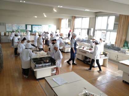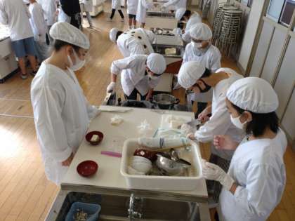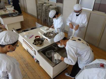 ご飯とみそ汁作り1 公開日 2022/11/11 更新日 2022/11/11 お知らせ 5年生は家庭科で「食事とみそ汁は食事の基本」を学習しています。本時では、ごはんとみそ汁作りの調理実習をしていました。ゴム手袋をして、感染対策を取りながら実施しました。 ご飯は鍋で炊くので、水の分量や火をかける時間など、より細かく進めなければいけません。みそ汁でも、いりこから本格的に出汁をとっていきます。 いいね(0)