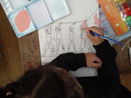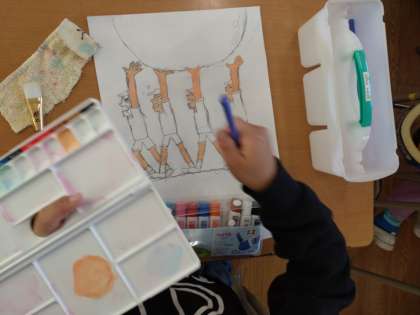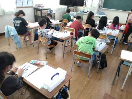 2年生は図画工作科で「大玉転がしの絵」を描いています。1組では、前時までに下描きした絵に色を塗っていました。大玉を持ち上げる数人の子どもの腕に、大きな重いものを持ち上げている力強さが感じられます。顔の表情や大量の汗に、一所懸命競技している様子がうかがえます。この下描きの良さを絵の具で塗りつぶさないように、ていねいに塗ってほしいです。