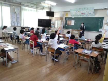2年生は算数科で「かけ算」を学習しています。1組では「8の段」の九九のつくり方について考えていました。黒板にはドーナツの写真が8個ずつ並んでいます。