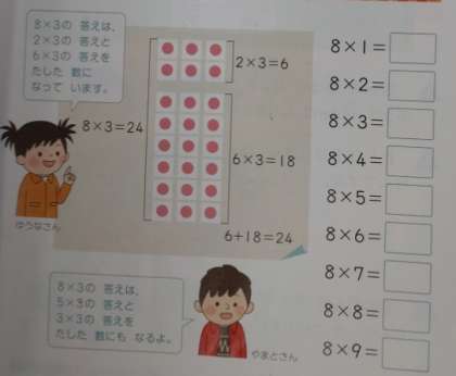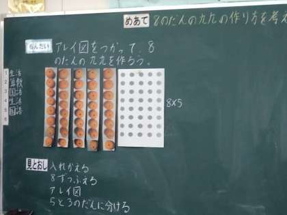 見通しでは「8ずつ増える」ことが出てきましたが、2の段では2ずつ、3の段では3ずつ増えていくのと比べて、8ずつ増えていくのは計算が大変なようです。かけ算を入れ替えて考える(「8×4」と「4×8」は同じ答えになる。)ことや、5の段と3の段に分けて考えるなどの見通しも出されました。