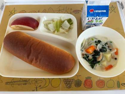 11月15日(火)の給食は、・黒糖パン・牛乳・キノコのクリームシチュー・キャベツのピクルス・りんごです。給食では、好き嫌いしないで食べるように指導しています。食べ物には、いろいろな栄養素が含まれていますが、すべての栄養素を含む食べ物はありません。いろいろな食べ物が力を合わせて、みなさんの健康を守ってくれています。