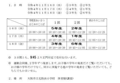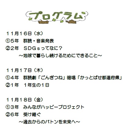 明日、11月16日(水)17日(木)18日(金)学習発表会があります。お子様の日ごろの学習活動での取り組みの成果をご覧ください。