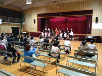 最初は5年生です。1・2組とも「Believe」の合唱と、学級の様子を作文にして群読をしました。どちらの学級も子どもたちがいきいきと活動している様子が感じられました。また、1組は「ルパン三世」の合奏、2組は「もののけ姫」のリコーダー演奏があり、みんなで心を一つにした音楽が聴かれました。
