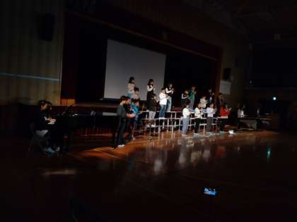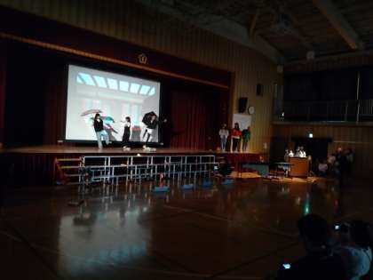 続いて、6年生「受け継ぐ〜過去からのバトンを未来へ〜」です。国語科で「町の未来を描こう〜町の幸福論 コミュニティデザインを考える〜」の学習をきっかけにして、歴史を振り返りながら自分たちの町・将来を見据える取り組みを寸劇にしていました。現在からタイムスリップして、さまざまな歴史の名場面が見られ、歴史上の人物が登場しました。軽快に流れていましたが、最後は子どもたちの強い気持ちが表れていました。最後に、司会に児童から終わりの言葉がありました。