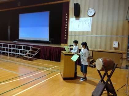 最初は3年生による「みんながハッピープロジェクト」です。いろいろな障がいをもった方の生活の工夫について調べ、白杖や点字ブロックなどには大切な役割があり、周りの人の支えも必要なことがわかりました。パラリンピックの歴史や内容についても発表しました。自分で調べてまとめた箇所を一人ひとりが責任もってしっかりプレゼンしていました。