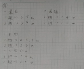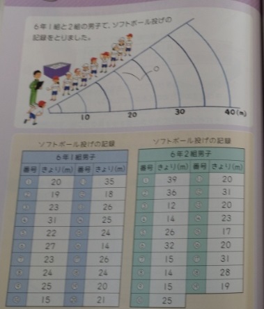 6年生では算数科で「資料の調べ方」について学習していきます。本時では、次のような「ソフトボール投げの記録」から、1組と2組のそれぞれの特徴について考えます。以前の学習で「平均」の単元で同じような問題を解いたことが思い出されます。