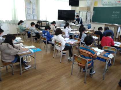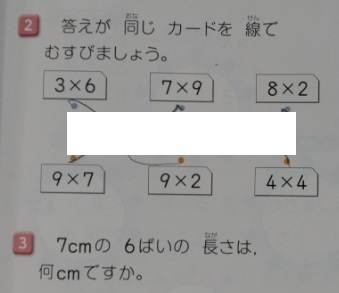2年生は算数科で「かけ算」を学習してきました。1組では全ての九九を学んで、たしかめポイントなど練習問題に取り組んでいました。(2)の問題のように、九九の性質を問われることがあります。また、(3)では「なんばい」の概念を理解しておく必要があります。(4)では、「式は『6×8』だ!簡単だな。」と思った児童はないでしょうか。問題と式をつなげて考える必要があります。ひとつずつ確認しながら練習問題をこなしていました。