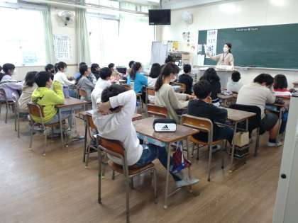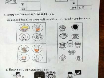 では、朝ごはんが「パンと牛乳だけ」「おにぎりとお茶だけ」の場合は、何が足らないのか、他にどんな食べ物が必要なのかを考え、栄養をバランスよく食べられる朝ごはんのメニューについて話し合いました。好きなメニューをそろえると、炭水化物やたんぱく質に偏ってしまうようです。何度か書き直して、やっとバランスよい朝ごはんにたどり着いた児童が結構いました。