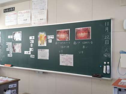 まず、2種類の猿の歯の写真を見比べて、餌の関係で動物園で飼育されている猿の歯は虫歯が多く、歯並びも悪いことがわかりました。そこから、嚙むことの大切さを学びました。また、虫歯や歯周病になってしまう原因と対策について学びました。