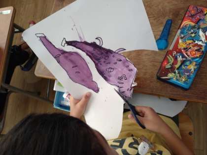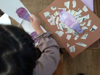 さつまいもの絵 公開日 2022/11/25 更新日 2022/11/25 お知らせ 2年生は図画工作科で「さつまいもの絵」を描いていました。生活科で収穫したさつまいもをスケッチして絵の具で着色していました。紫色の皮が部分によって、光の当たり方の違いによって、微妙に感じが違っています。サインペンの下描きと水の濃さを調節することでできる濃淡によって表していました。 この後、茶色の色画用紙に新聞紙を重ね貼りして、その上にさつまいもの絵を貼っていました。収穫時の様子を表しています。 いいね(0)