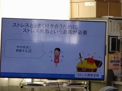 11月28日(月)4時限目、精神科認定看護師の方をお招きして、4年生へ「こころの健康教室(学校保健委員会)」を実施しました。子どもが感じるストレスの種類や原因、それに伴う症状を心・体・行動面から教えていただき、児童の活発な意見交流がありました。そして、ストレス発散宝箱の大切さ・使うタイミング・ストレスをなくす方法を知ることなどを知れば、自分を成長させてくれるストレスもあるので、うまく付き合うことが大事だということを知りました。