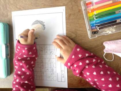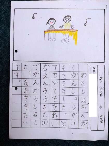 1年生は、音楽鑑賞会の後、聞いたことや感じたことを絵日記に表していました。児童には、多様な楽器について印象が強かったようで、「マリンバ」「ドラム」など、登場した楽器の名前を思い出していました。先生から「感じたこと・思ったこともかきましょう。」という助言がありました。「すてきな音楽だった。」と言葉で表すだけでなく、絵日記なので、演奏している方々の顔が楽しそうにえがかれているのを見ると、絵でも感じたことを表していると思いました。