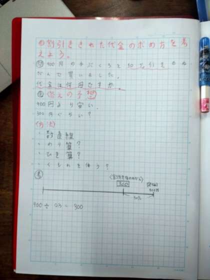 ○%引き、□割引き2 公開日 2022/11/30 更新日 2022/11/30 お知らせ 見通しでは、「900円より安くなりそう。」「数直線で考える。」「くものわ(くらべる量・もとにする量・割合」の関係を表す公式図)を使う。」などが出されました。 「900÷0.3=300 答え300円かな」「いや、900はくらべる量ではない」 「900円の30%は『900×0.3=270』で答えは270円になる」「いや、30%引きだから……。」 落とし穴がいくつもあるので気をつけて解いてほしいです。 いいね(0)