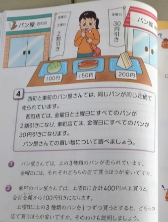 5年生は算数科で「割合」を学習しています。2組では次のような問題を解いていました。金曜日、西町のパン屋は2割引き、東町のパン屋は30円引き、どちらがお得なのか、パンの代金によって違うようです。土曜日になると東町のパン屋では、また違ったサービスがあります。児童は、まるで自分たちのことのように、「この代金のパンは、○町で買った方が得だ。」など、真剣に考えていました。