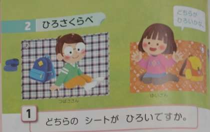 どちらが ひろい 公開日 2022/12/02 更新日 2022/12/02 お知らせ 1年生は算数科で「どちらが おおい どちらが ひろい」の学習をしています。本時では、次のような(あ)と(い)のシートの広さを比べます。見た目では、どちらが広いのか少しはっきりしません。正しく比べる方法はないでしょうか。 話し合って「重ねる」という方法を発見しましたが、重ね方には気をつけないことがあるようです。 いいね(0)