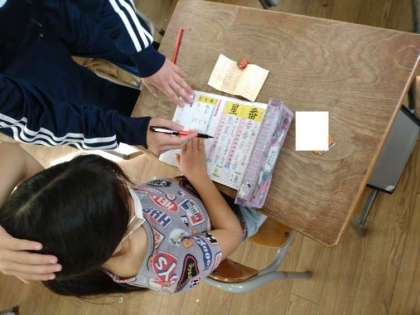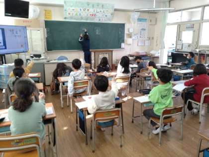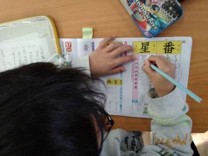 2年1組では新出漢字「番」と「星」を学んでいました。どちらも画数が多いので覚えるのが大変です。また、そちらの漢字も、上の部分と下の部分を組み合わせてできているので、バランスよく書くのが難しそうです。たとえば、上の部分も大きく描き過ぎないように気をつけてほしいです。さらに、「番」の上の部分では、「ノ」を忘れて「米」と書いてしまう間違いが多いらしいです。