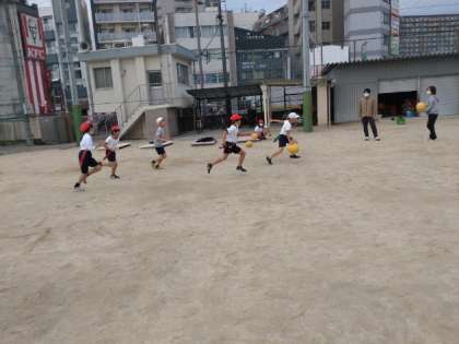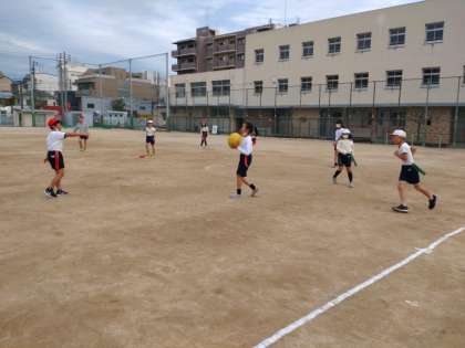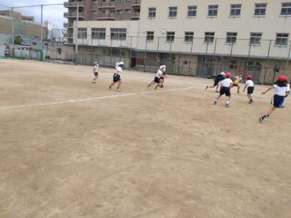 4年生は体育科で「タグラグビー」に取り組んでいます。通常のラグビーと比べ、タックルの代わりに相手のタグを取ること、スクラムは組まないことなど、通常のラグビーとは違いますが、ボールを持っている人も持っていない人も思い切り走ることには変わりないようで、チーム全員が体力を使います。ついついボールを前方へパスしてしまうこともあり、慣れるまでもう少しかかりそうですが、みんな力いっぱいゲームに参加していました。