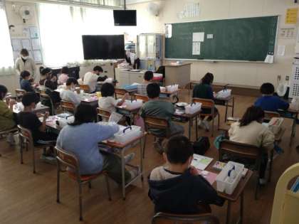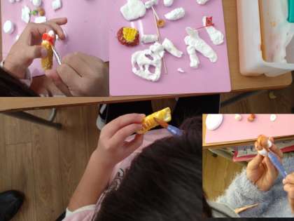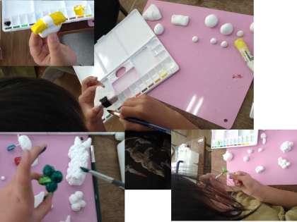 お弁当作り 公開日 2022/12/06 更新日 2022/12/06 お知らせ 2年生は図画工作科で「お弁当作り」に取り組んでいます。2組では、前時に紙粘土で作ったお弁当のおにぎりやおかずに、本時では絵の具で着色していました。真っ白な時もおいしそうでしたが、色をつけてみるとますます本物に近づいていくようでした。エビフライ・卵焼き・おにぎり・ブロッコリー・ハンバーグ……。美味しそうなメニューが次々につくられ、机上はお弁当の華やかなおかずで彩られていきました。 いいね(0)