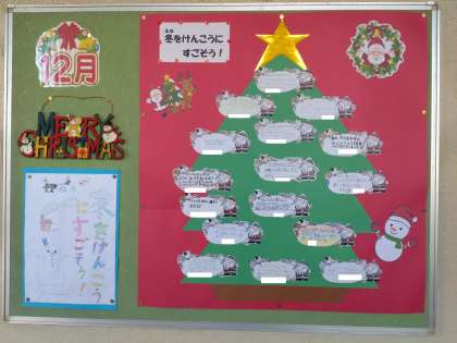 保健室横の掲示板に「冬を けんこうに すごそう」と題したクリスマスツリーが展示されています。そのクリスマスツリーには、健康に過ごすうえで、みんなに取り組んでほしいことを、保健委員の児童が書いたカードが飾られています。
