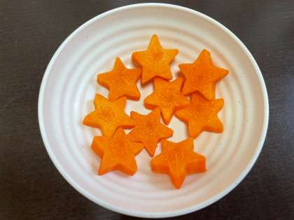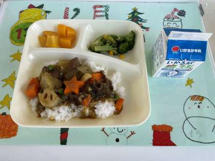 12月8日(木)の給食は、冬野菜のカレーライス・牛乳・ブロッコリーとコーンのサラダ・黄桃(カット缶)です。2枚目の写真はラッキーにんじんです。ニンジンをこのように切って、カレーライスの中に入れています。カレーライスの中に入っているのを見つけたら、今日1日、幸せなことがあるかもしれません。