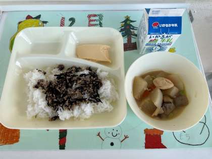 12月9日(金)の給食の献立は、卵どうふと、一口がんもと野菜の煮もの、魚ひじきそぼろ、ごはん、牛乳です。がんもどきは、大豆製品の一つで、「がんも」と呼ばれています。水分をきってつぶしたとうふに、細かくきざんだ野菜やこんぶなどをまぜ、丸めてから油であげます。「がんも」という名前の由来は、鳥の雁(がん)の肉に味を似せてつくられた等、いろいろな説があります。