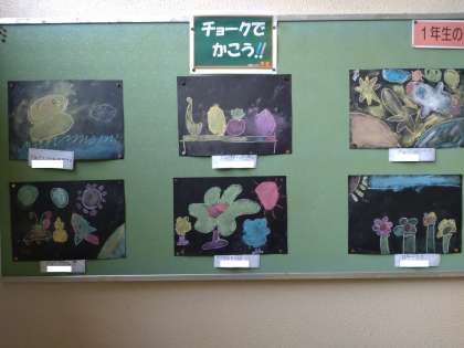 1年生の掲示板に図画工作科で描いた「チョークで かこう!!」の絵が展示されていました。「でんせつの ウチュウ」「たべもの いっぱいやさん」「おはなしの くに」など、メルヘンの世界を描いた作品が並んでいます。