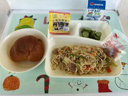12月12日(月)の給食は、黒糖パン・牛乳・和風焼きそば・きゅうりのしょうがづけ・いり黒豆です。給食当番は、服装を整えて、清潔に給食の準備をするように指導しています。マスクは、花と口を覆うようにつけるようにしています。エプロンのボタンは、きちんと留めるようにしています。髪の毛は帽子の中に入れ、長い髪の毛は束ねるようにしています。爪は短く切っておき、手は石けんでていねいに洗うようにしています。